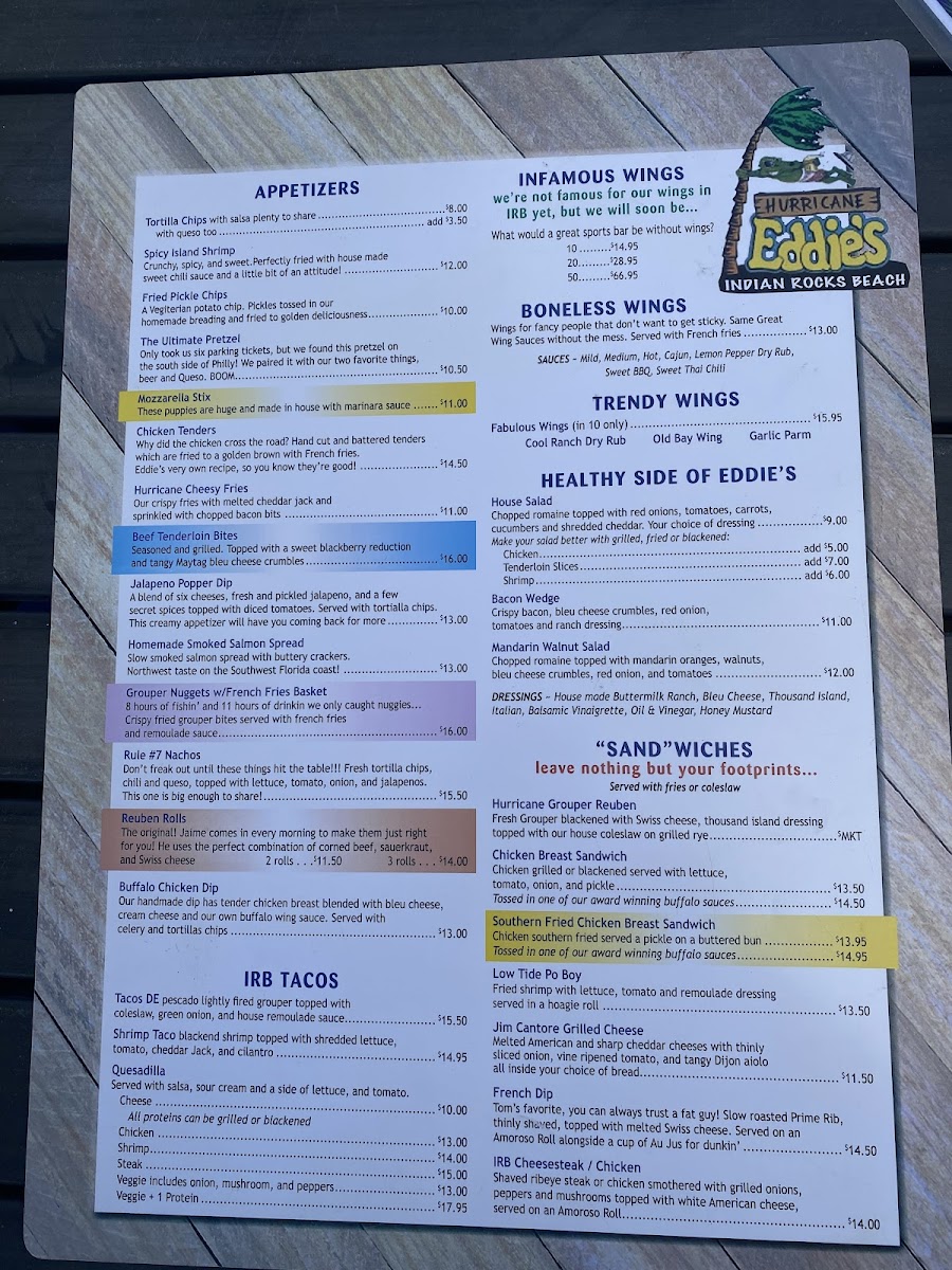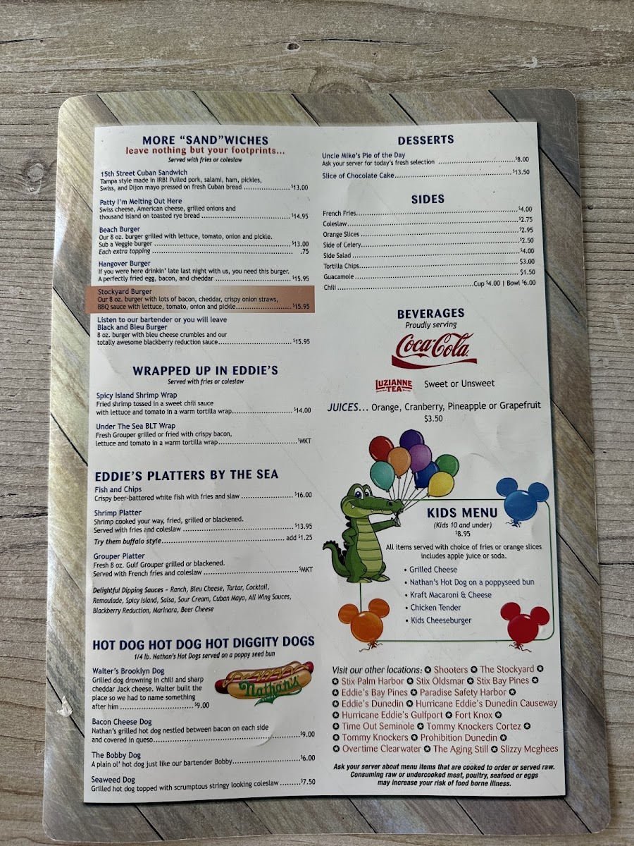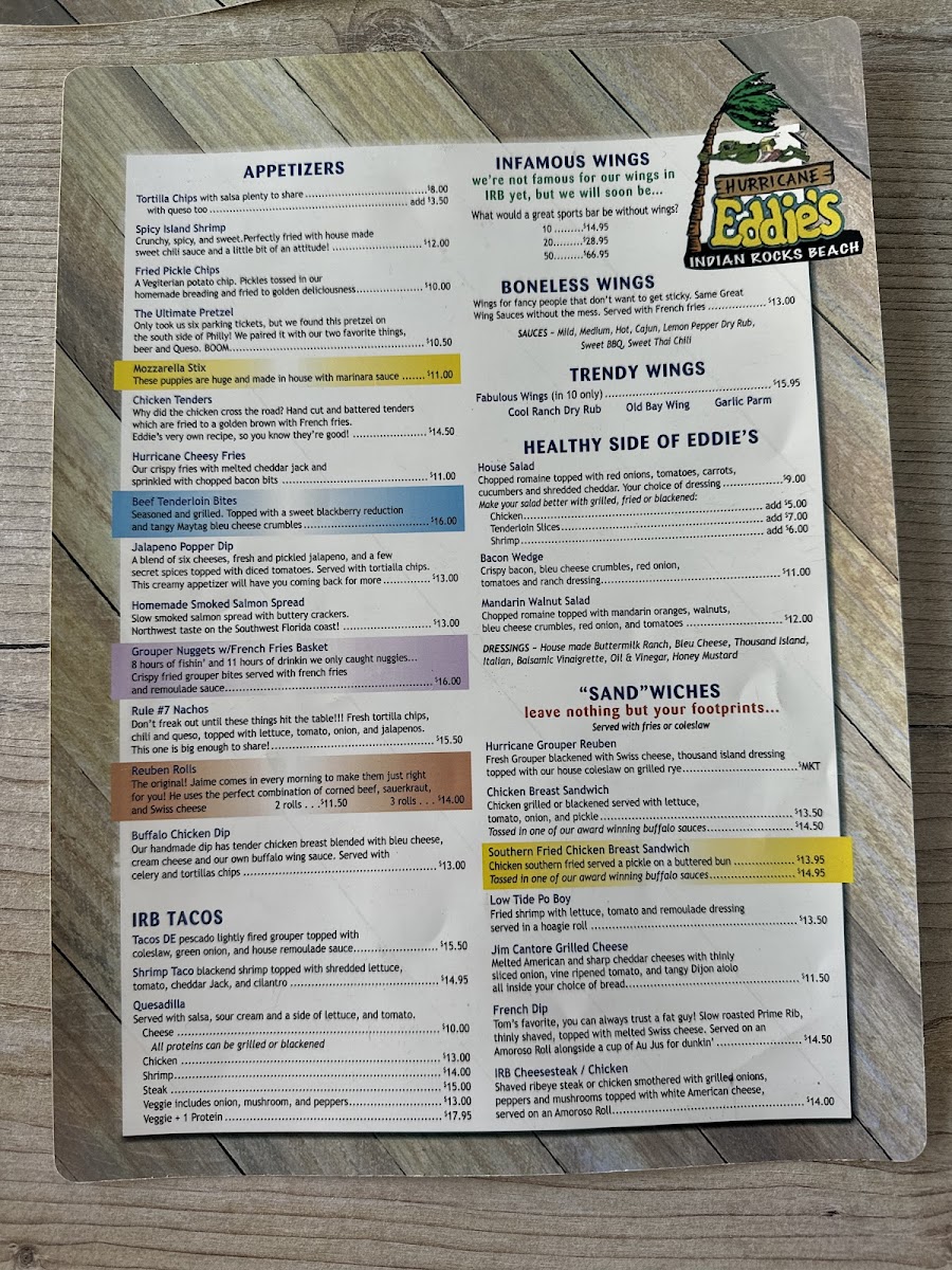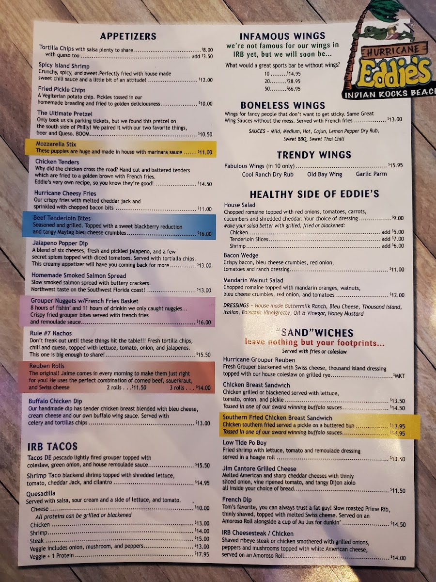 Hurricane Eddie's Indian Rocks Beach offers a laid-back menu featuring casual bites and comforting drinks that perfectly complement its beachside atmosphere. Whether you're stopping by for a midday meal or settling in for an evening with friends, the menu balances classic bar favorites with island-inspired twists.